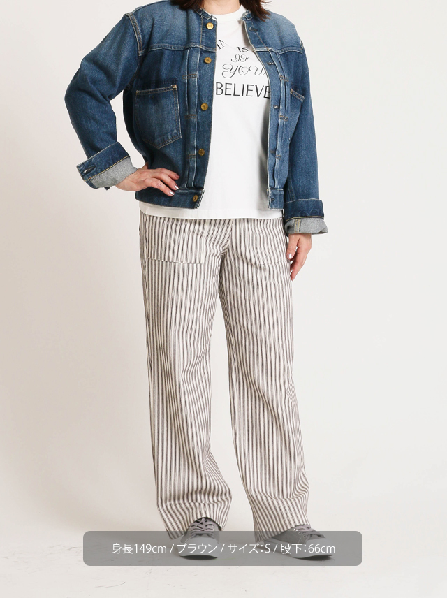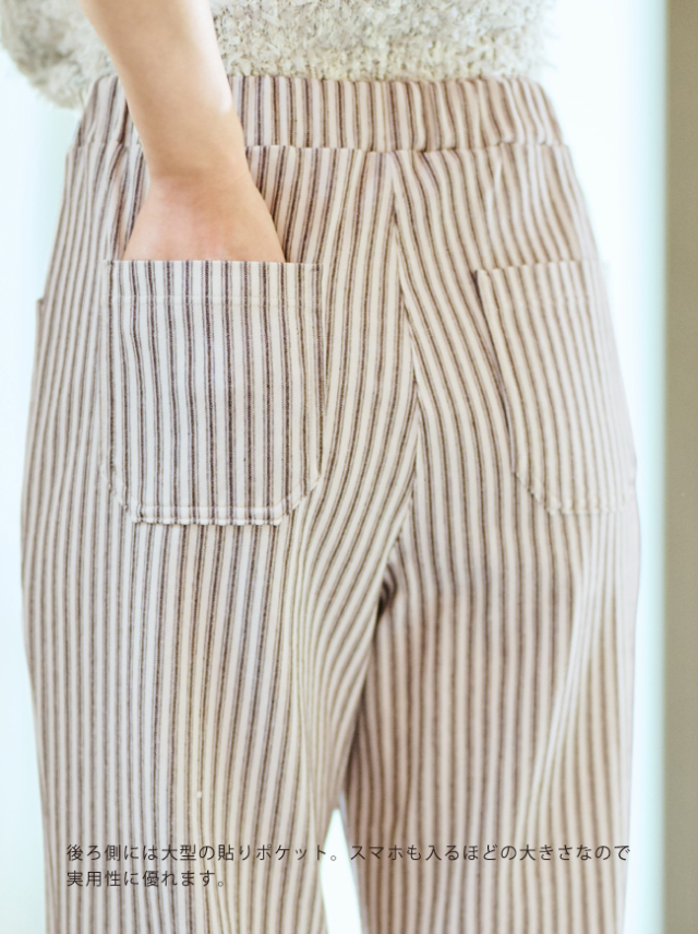 綿100%トリコット編みのヒッコリーストライプベイカーパンツは、ナチュラルなストレッチ性とUVカット(紫外線遮蔽率92%以上)、通気性も抜群で暑さの残る日も快適に着こなせます。 後ろウエスト部分にはギャザーをあしらい、ヒップラインを拾わない上品なシルエットに。 前後に施した大きな四角いポケットがデザインのアクセントとなって、カジュアルになりすぎない大人のパンツスタイルを演出します。 男女兼用なので、パートナーとのお揃いコーデも素敵。 (男性がご着用いただく場合の参考サイズは、普段のサイズよりワンサイズ上がおすすめです。) ※綿素材の特性上、他のパンツと比較すると若干シワが入りやすいため、梱包タイプは通常梱包(ダンボール箱)をおすすめいたします。