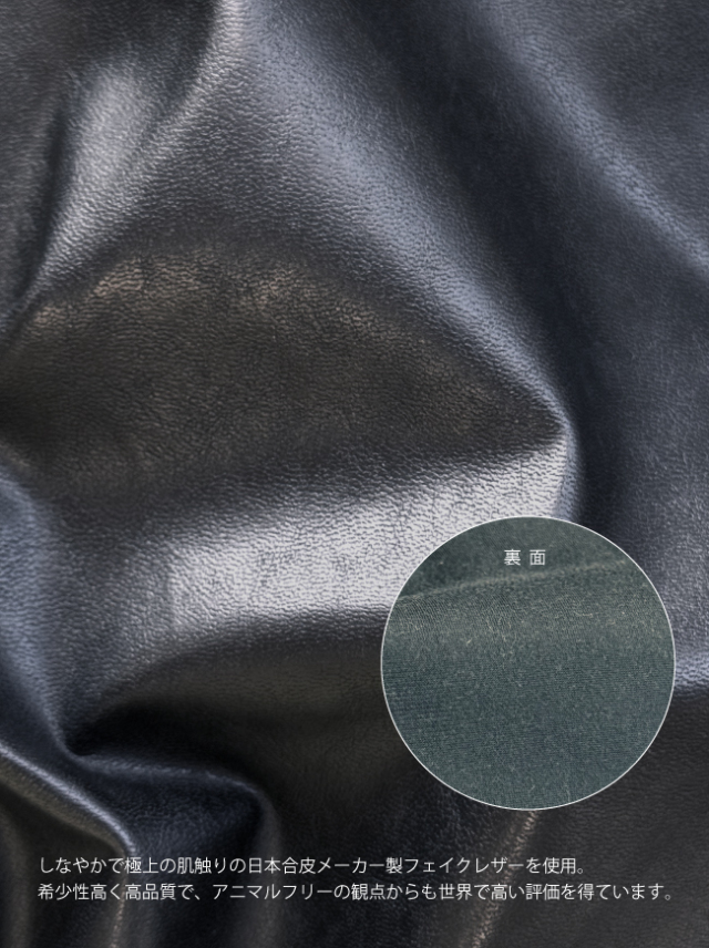 欧米の高級車や航空機のシートも手掛ける日本の合皮メーカーが、日本製にこだわって仕上げた特別素材を採用しました。ほどよいゆとりを残したテーパードラインは、女性らしいシルエットを美しく引き立て、ハードになりすぎず上品な印象を演出します。フロントのインタックがウエストまわりをすっきりと見せ、斜めポケットで実用性を添えました。さらに、後ろの飾りポケットが腰位置を高く見せてくれるのも嬉しいポイントです。高品質なフェイクレザーはご家庭の洗濯機でお手入れができ、10回洗っても色落ちや合皮割れがしにくいのが特長。レザーの風合いを楽しみながら、普段の装いにすっと馴染む一本です。