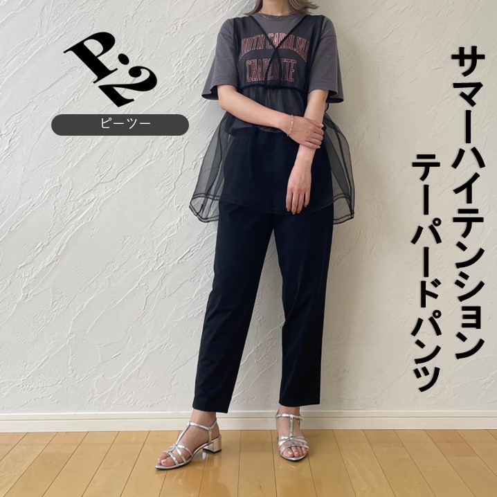 大人可愛いチュールのトップスに合わせて、黒のテーパードパンツが引き締めてくれますね。