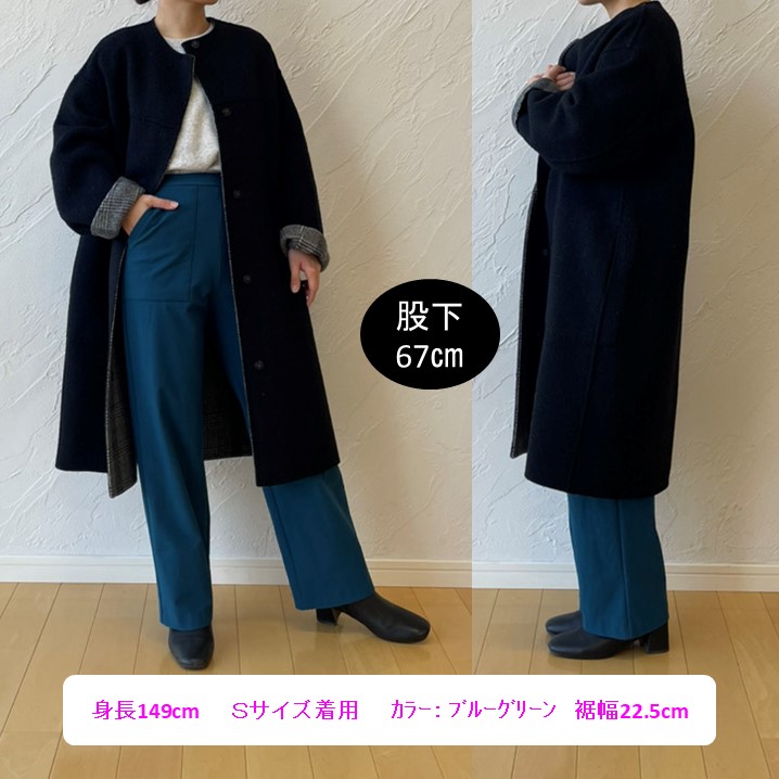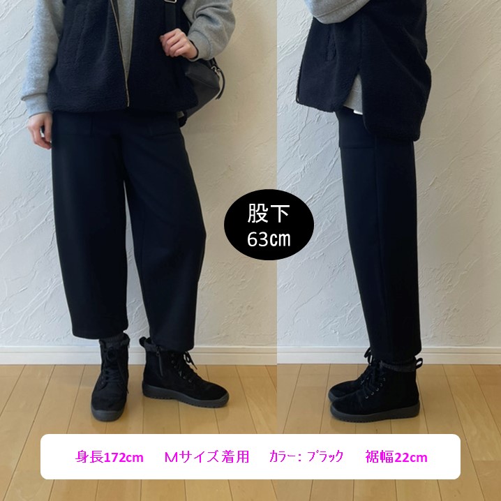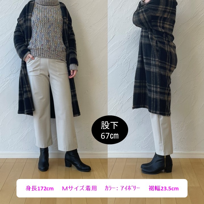 とても地厚で暖かい素材を使用していますが、地厚さを感じさせないようなカーブラインの効きを感じます。 すっきり見えの丸みのあるバレルシルエットなので、低身長の私でも、足元が野暮ったくなる心配はありませんでした。(Yスタッフ)