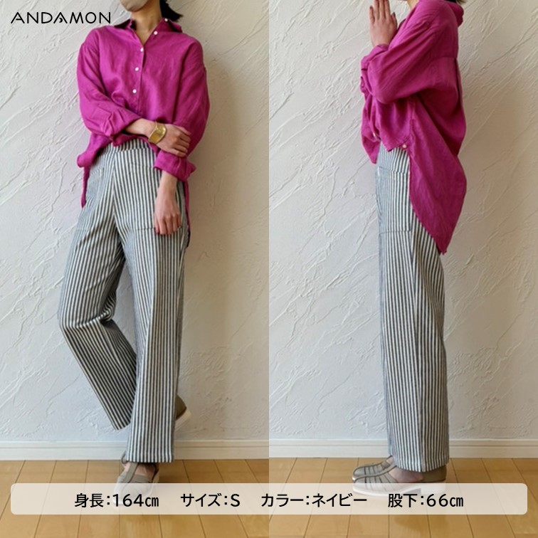 体のラインを拾わないワイドストレートシルエットは、センタープレスが施されているので、脚長・美脚効果も抜群です!