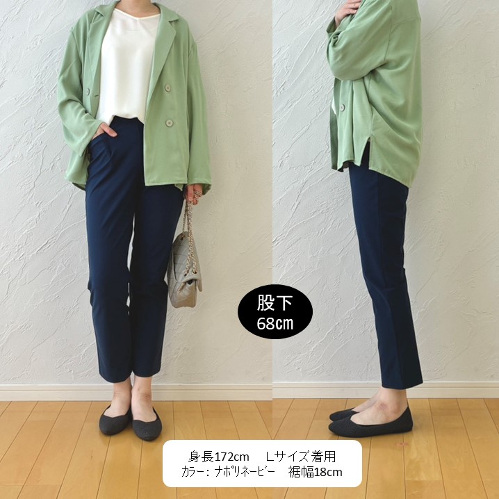ナポリネイビーのパンツに、グリーンのゆるジャケットを合わせて軽やかに。