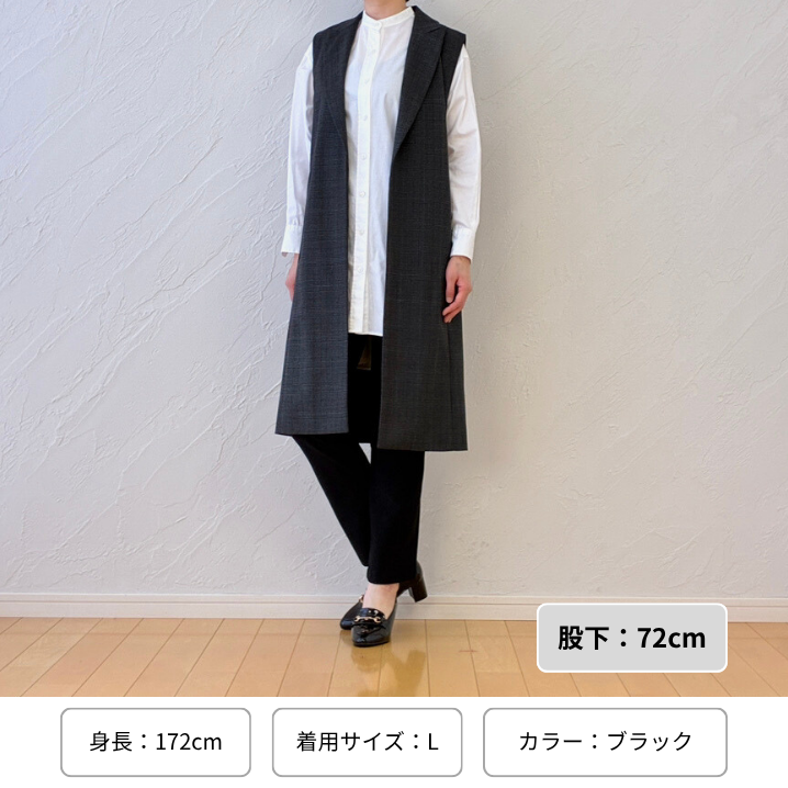 ロングジレを羽織れば、すっきりとした縦ラインが生まれ、クールな大人の装いに。