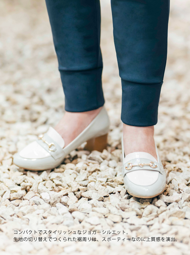 裾が足首のリブ(ゴム)できゅっと絞られたジョガーパンツだから、足さばきが良く日常の動作がしやすい設計です。ほど良いフィット感で裾まわりがもたつきにくく、自転車に乗るちょっとしたお出かけにもおすすめ。ブーツやスニーカーとも相性◎