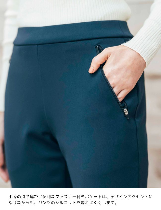 前身頃にはファスナーポケットを配しており、外出時の小物収納に便利。コンパクトな見た目ながらストレッチ性が高く、腰まわりの窮屈感が少ないため、長時間の着用でも快適にお過ごしいただけます。
