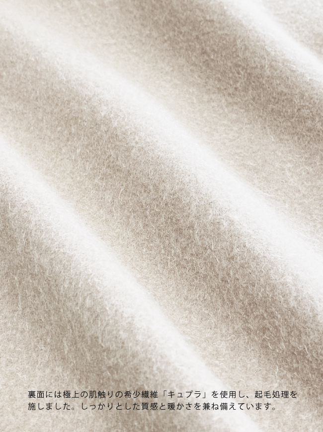肌に触れる面には旭化成のキュプラを使用し、なめらかな起毛を施しました。冬のお出かけや旅先での長時間の着用でも、快適さを保ちやすい素材です。上質な素材感と実用的なディテールで、寒い季節の装いに安心と快適さを添えてくれます。