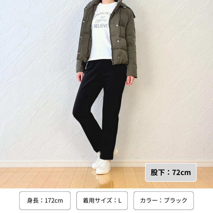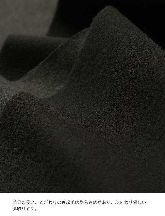 肌あたりはなめらかで、ぬくもりが優しく広がります。起毛素材のパンツにありがちな“もたつき”が出にくく、いつものコーデに合わせるだけで上品な冬の装いが完成します。