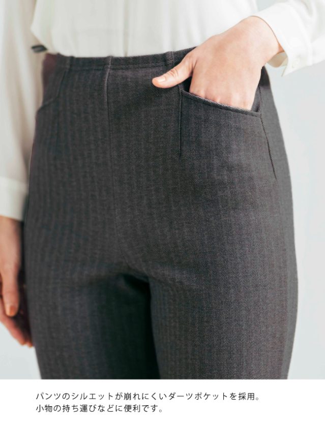 ウエストからヒップにかけては、女性の丸みに沿う立体的なつくりを取り入れ、穿いたときのなじみの良さを大切にしています。シルエットに響きにくいダーツポケットは、見た目のすっきり感を損なわず、小物を入れたい時に使いやすい上品な設計です。