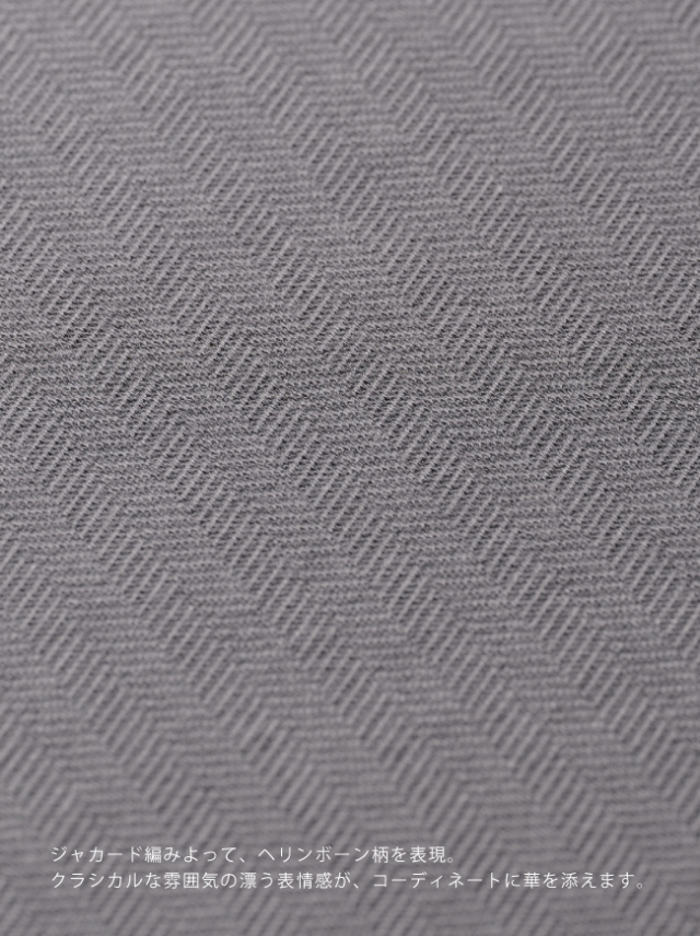 ヘリンボーン柄は、近くで見ると編みならではの陰影が浮かび、素材の奥行きが感じられます。遠目には無地のように落ち着いて映り、柄物が苦手な方でも取り入れやすいのが魅力です。コートやニットを重ねる冬の装いでも重たくならず、全体の印象をやさしく整えてくれます。