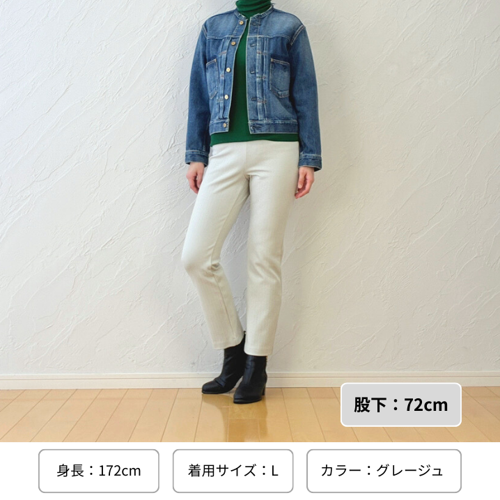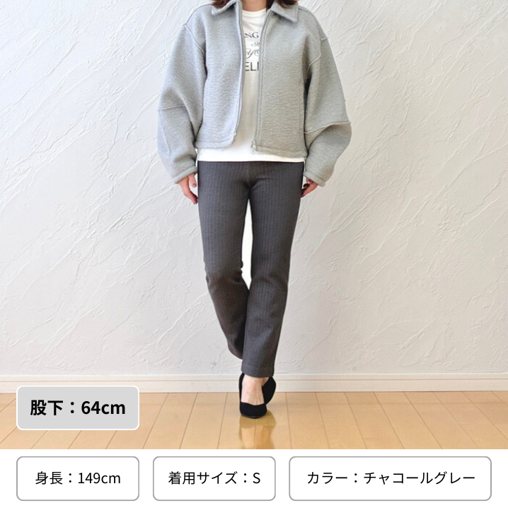 チャコールグレーに白のロゴTシャツと淡いグレーのブルゾンを合わせると、軽やかさと落ち着きがほどよく調和したカジュアルスタイルになります。股下64cmは小柄な方でも裾がまとまりやすく、足元がすっきりと見えるのが魅力です。日常のお買い物や散歩など、気軽なお出かけにも取り入れやすい装いです。