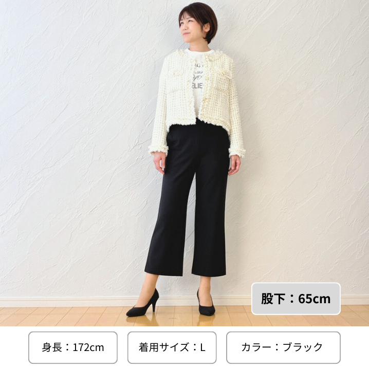 ブラックに白のツイードジャケットを合わせると、きちんと感のある大人のモノトーンスタイルが完成します。黒のセミワイドは落ち着いた印象がありながら重たく見えにくく、足元のヒールとも相性よくまとまります。ワイドすぎないシルエットが動くたびに軽さを感じさせ、上質な素材の風合いが装い全体を品よく整えてくれます。ロゴ入りのTシャツともなじみやすく、気張らずに取り入れられる組み合わせです。