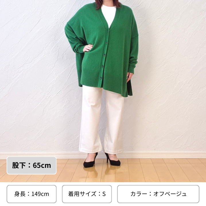 オフベージュにグリーンのカーディガンを合わせると、やわらかな明るさの中に深みのあるアクセントが生まれます。セミワイドのほど良い広がりが軽やかに映り、明るい色のパンツでもすっきり見えるバランスに。足元にヒールを合わせることで縦のラインが整い、シンプルなコーデも上品にまとまります。