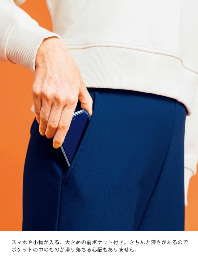 前側には大きめのポケットを配し、小物やスマートフォンを収納しやすい実用的なつくりに仕上げました。シルエットにできるだけ響きにくいよう配慮されているため、見た目のすっきり感と便利さの両方を兼ね備えています。ちょっとそこまで出かける時にも、バッグを増やさずに身軽に動けるのがうれしいところです。