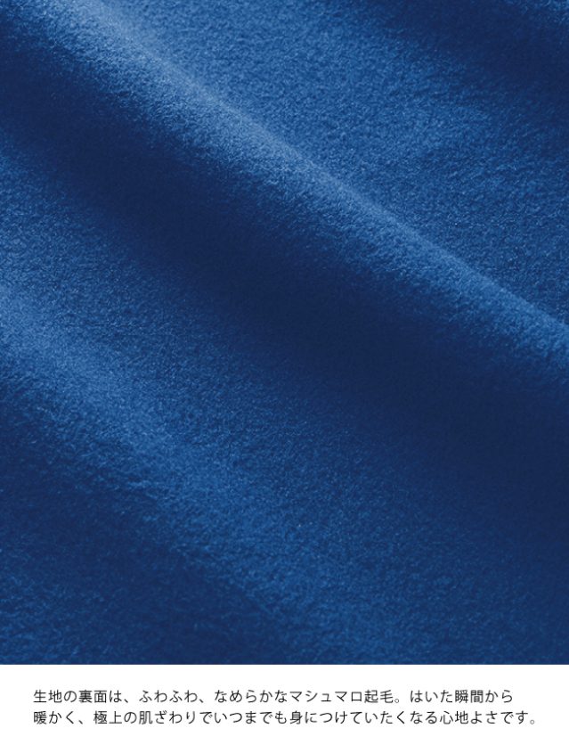 肌に触れる面には、マシュマロタッチのなめらかな裏起毛をほどこしています。肌あたりがやわらかく、寒い季節の外出時にも頼りになる仕上がりです。ご自宅の洗濯機でお手入れできるイージーケアも、冬場にうれしいポイント。上質でソフトな風合いとセミワイドシルエットが合わさることで、エレガントな印象を演出してくれます。