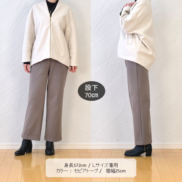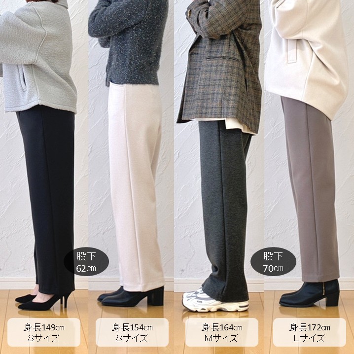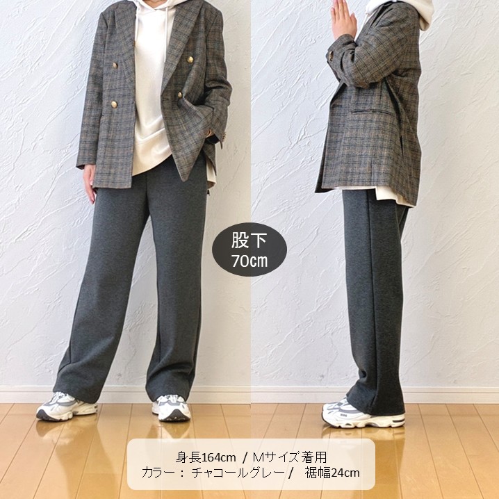 ストレートシルエットのパンツは、長身でもバランスよく穿ける股下70cmで脚長効果も◎