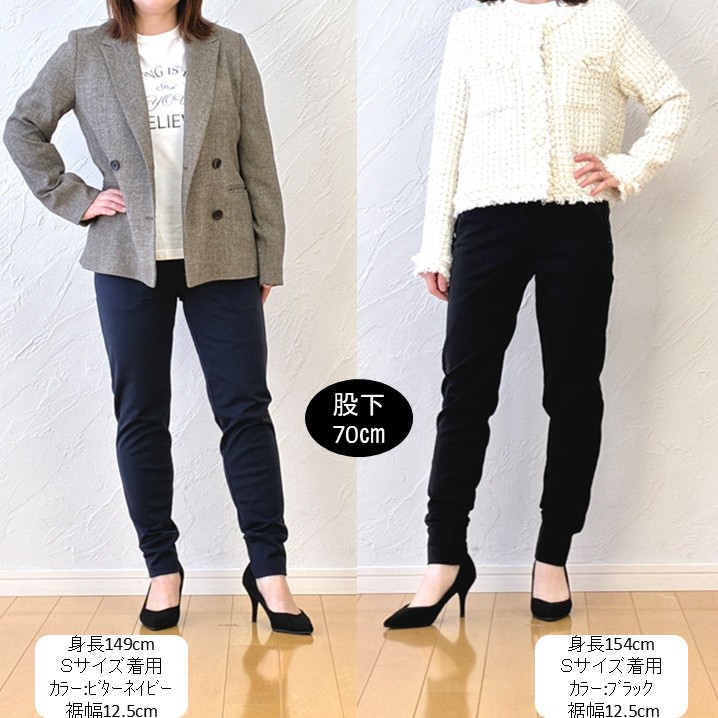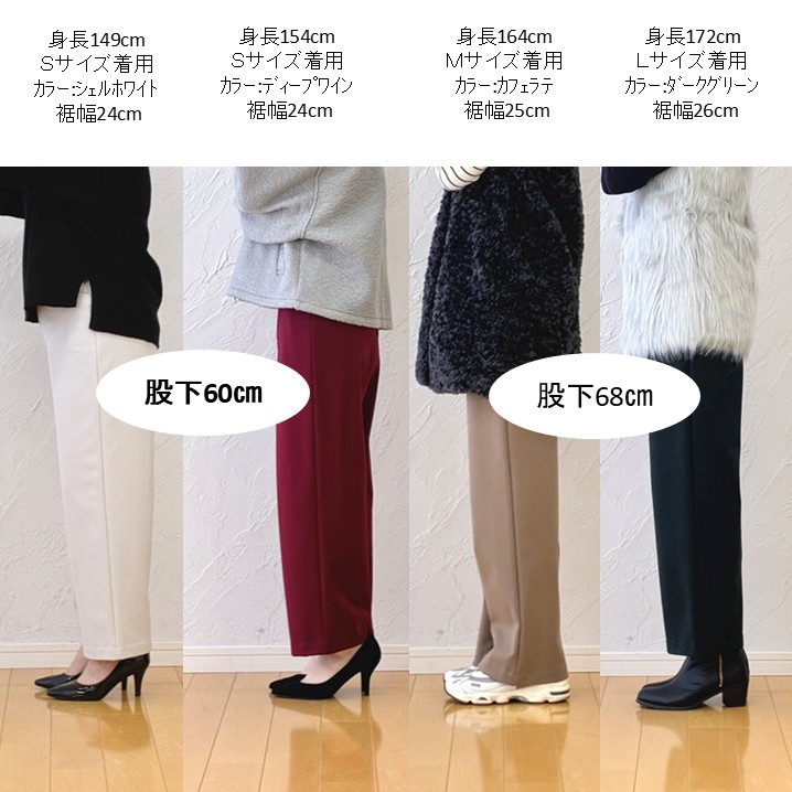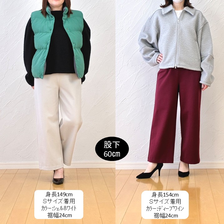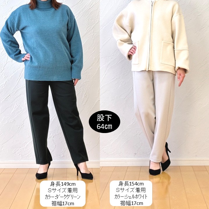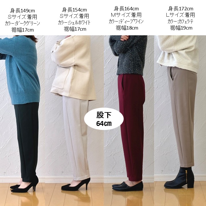 149cmでも、64cmの股下が足首でほどよくクッションする、上品な丈感に。