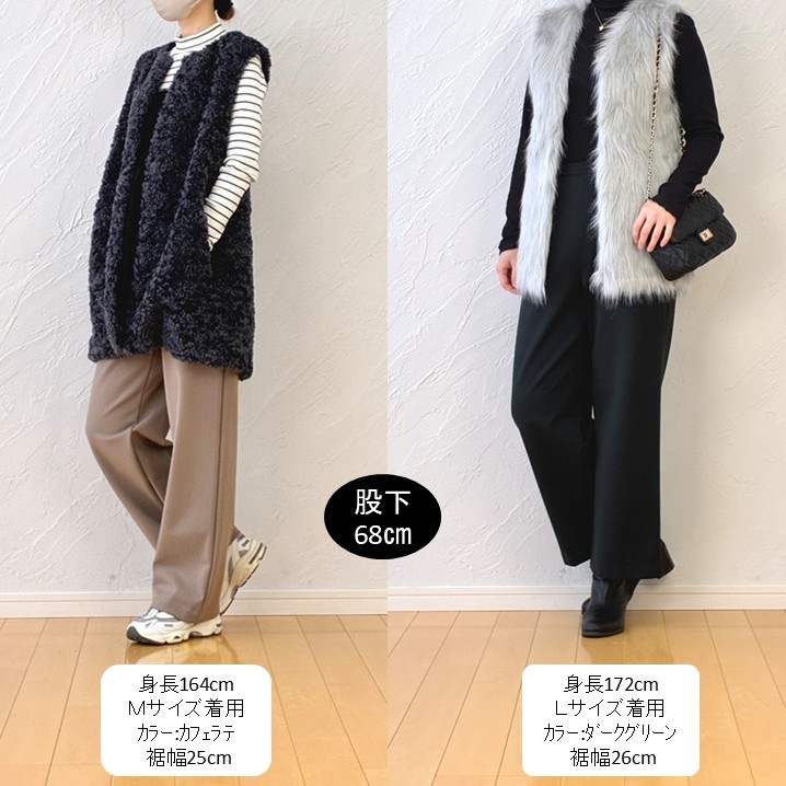 柔らかいカフェラテのパンツに、もこもこベストを重ねた冬らしいレイヤード。