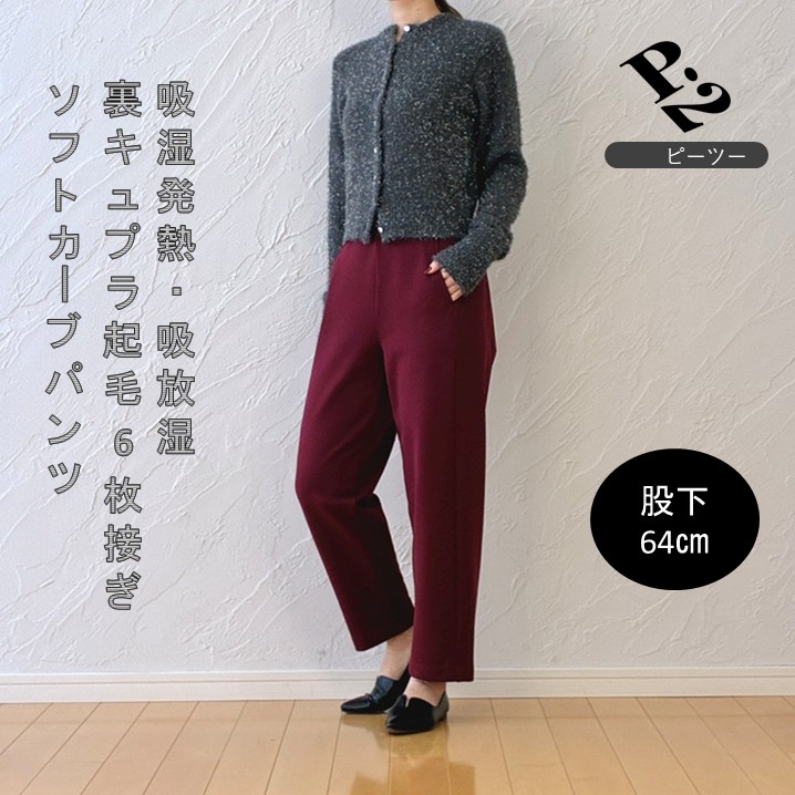 ●【ピーツー】 吸湿発熱・吸放湿 裏キュプラ起毛 6枚接ぎ ソフトカーブパンツ