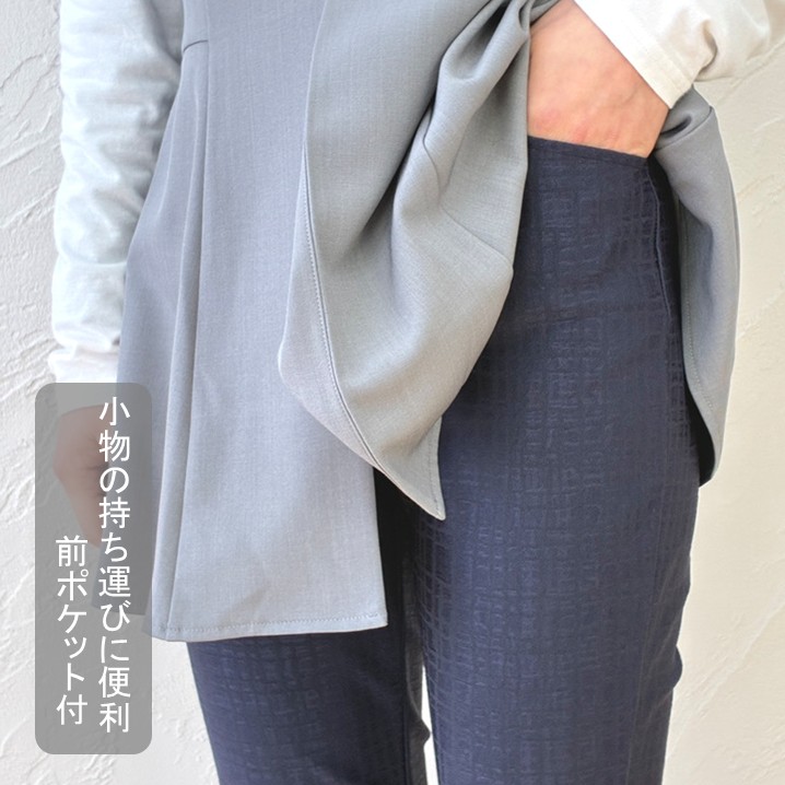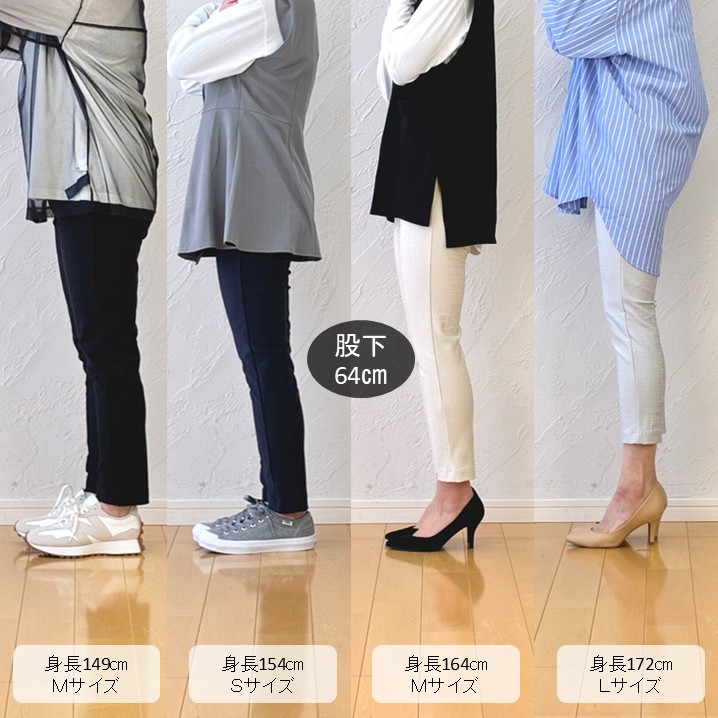 ③魔法のシルエット:ウエスト総ゴムとは思えないすっきり感。ヒップラインを美しく包み込み、脚を長く見せます。