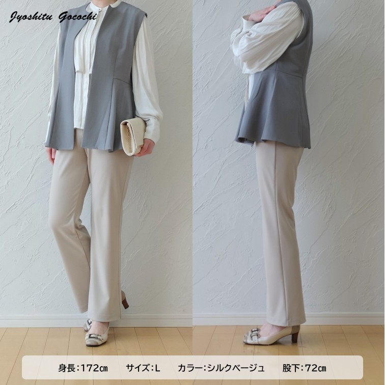 とろみのある柔らかな素材が生む落ち感で、セミフレアのラインがすっきりときれいに見えるパンツ。さらりとした肌触りで軽やかに穿け、ベスト×ブラウスのレイヤードとも相性抜群。上品さと抜け感を両立した大人のきれいめコーデです。