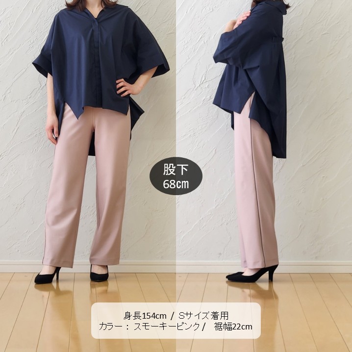 🟥優しいニュアンスカラーのスモーキーピンクのパンツに、シックなネイビーのブラウスを合わせた大人フェミニンな装い。