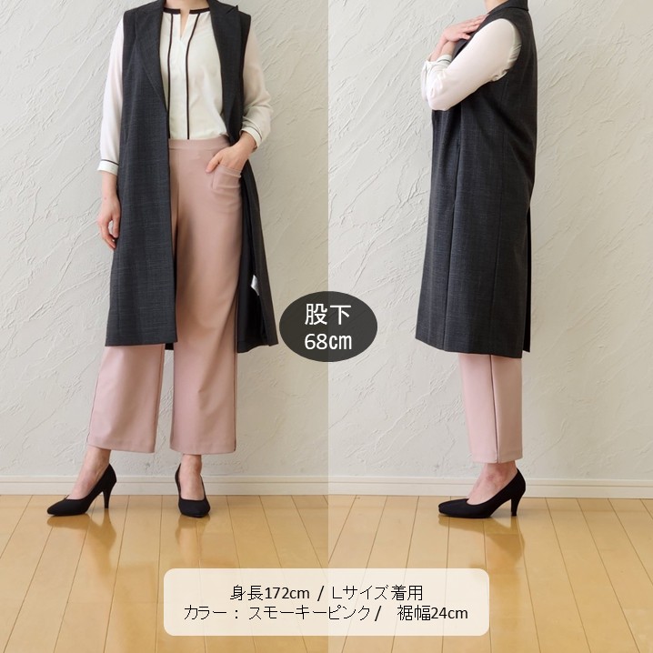 🟥優しいスモーキーピンクのパンツを、ハンサムなロングジレで引き締めた甘辛ミックスコーデ。
