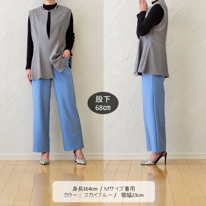 フレアシルエットのジレが、腰回りをカバーしつつ、パンツの縦ラインと繋がってスタイルアップ効果も抜群。