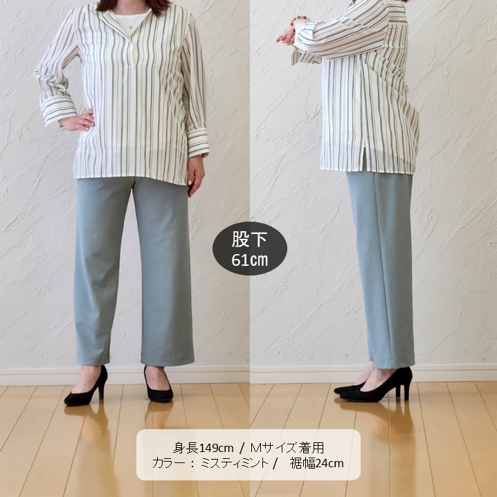 🟩爽やかなミスティミントのパンツに、同系色のストライプシャツを合わせて縦ラインを強調したスタイル。