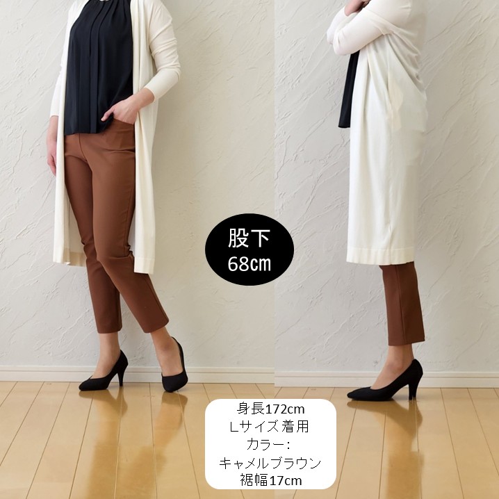 縦に流れるロングカーディガンが、全体をすらりと見せてくれます。パンツは股下68cmで足首がのぞく丈感。