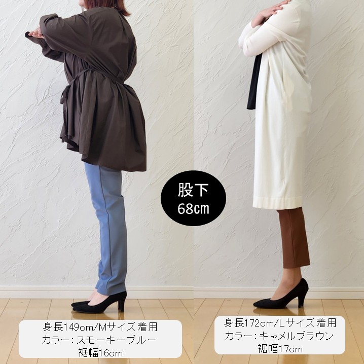 股下68cmの丈感は、低身長さんが着用するとややフルレングス寄りの印象。