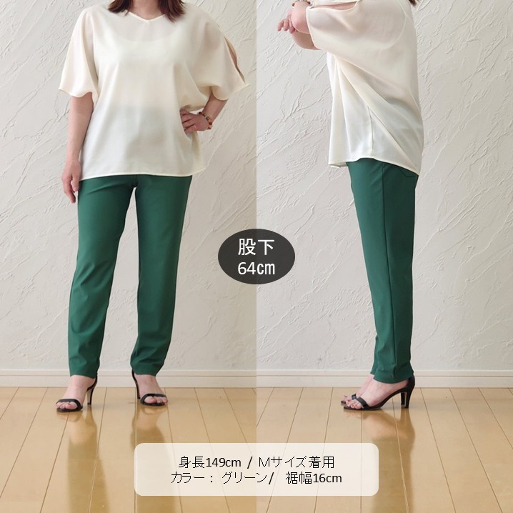 🟩美しい発色のグリーンパンツに、とろみ感のあるブラウスを合わせ、女性らしい柔らかさをプラスした装いです。