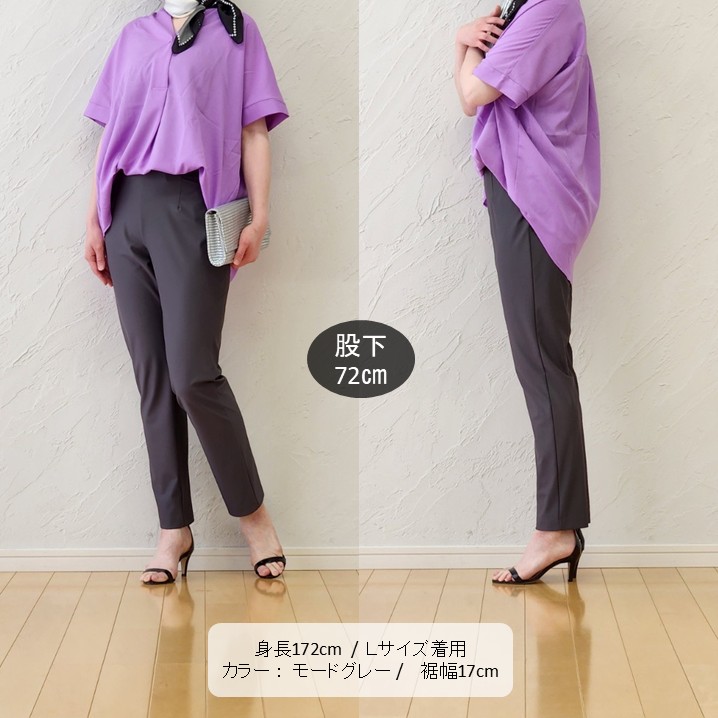 脚のラインを拾いすぎない絶妙なシルエットのパンツに、発色の良いパープルのブラウスを合わせることで、シックな中にも華やかさをプラス。
