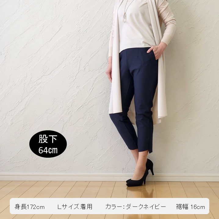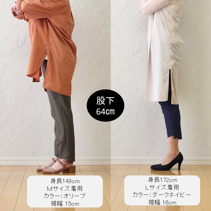 しかもこのパンツ、ただの機能派じゃないんです。裾に入ったさりげないスリットが、足首をすっきり見せてくれて、ぐっと女性らしい印象に。スリミングカットは、前から見ると細見え、後ろ姿は脚長見え。