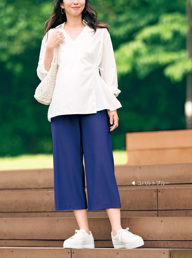 ゆったりとした柄ブラウスに、初夏にぴったりなコバルトブルーのミモレパンツで、鮮やかなカラーがコーディネートを一気に華やかにしてくれます。ほどよい抜け感がありながらも、上品さはしっかりキープできる大人カジュアルな着こなしです。