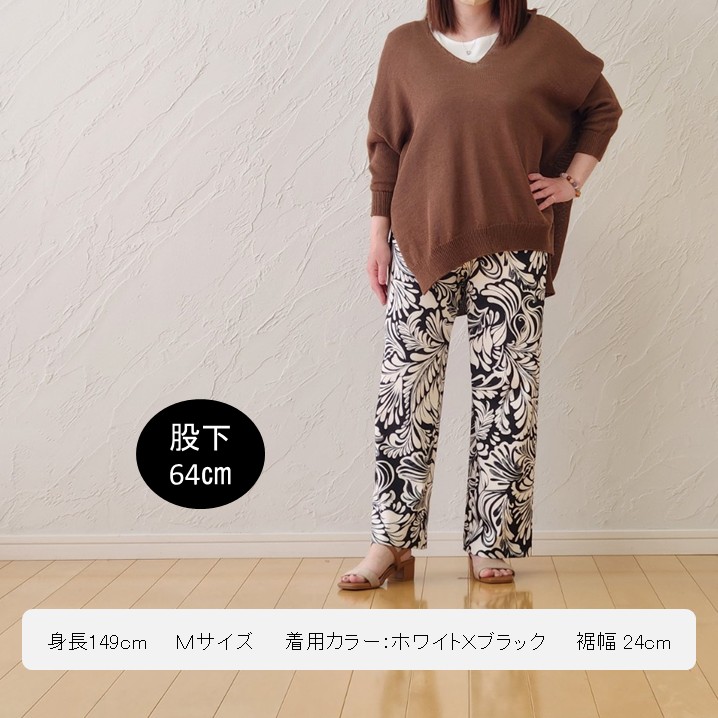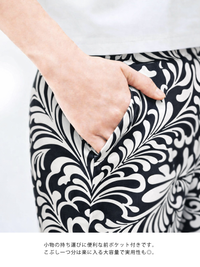 モノトーンのボタニカル柄が印象的なモノトーンプリントゆったりストレートパンツは、シンプルなトップスと合わせるだけでコーデが決まる優秀アイテム。